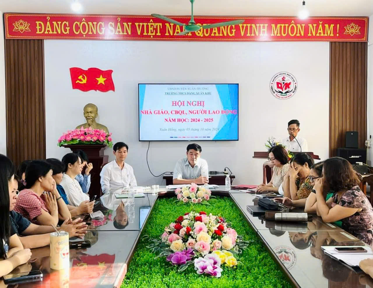 Thực hiện Luật dân chủ ở cơ sở; Căn cứ chương trình kế hoạch năm học 2024-2025, được sự nhất trí của Chi uỷ nhà trường, chiều ngày 05 tháng 10 năm 2024, Ban giám hiệu, Ban chấp hành công đoàn Trường THCS Đặng Xuân Khu đã tổ chức Hội nghị nhà giáo, cán bộ quản lí, người lao động năm học 2024-2025. Hội nghị là đợt sinh hoạt quan trọng của tập thể nhà giáo, CBQL, người lao động nhà trường trong năm học nhằm đánh giá các kết quả thực hiện nhiệm vụ năm học, các phong trào thi đua trong tập thể sư phạm nhà trường, kiểm điểm trách nhiệm của người đứng đầu đơn vị. Đây cũng là dịp để nhà giáo, CBQL, người lao động chia sẻ những vấn đề còn tồn tại trong thực hiện nhiệm vụ, phát động phong trào thi đua, xây dựng các tiêu chí phấn đấu, đánh giá thi đua, qui chế làm việc, qui chế dân chủ trong nhà trường và các tiêu chí khác có liên quan.