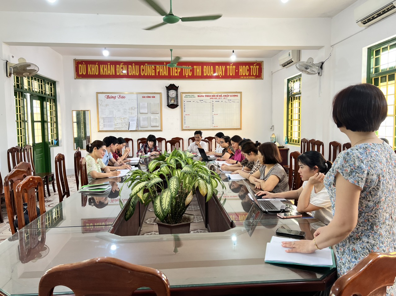 Phát biểu chỉ đạo các buổi sinh hoạt chuyên môn của các tổ, Đại diện Ban giám hiệu đã ghi nhận, biểu dương chúc mừng những kết quả của các tổ chuyên môn trong thời gian qua, biểu dương kết quả khảo sát các bộ môn lớp 9, coi đây là hình mẫu của sự cố gắng mà các tổ nhóm chuyên môn cần học tập. Xác định rõ nhiệm vụ trọng tâm trong thời gian tới tập trung cao cho công tác ôn tập, kiểm tra, đánh giá, đại diện Ban giám hiệu đề nghị các tổ chuyên môn nghiên cứu khắc phục những vấn đề tồn tại trong thực hiện nhiệm vụ chuyên môn mà Phòng GD&ĐT đã chỉ ra đồng thời quyết tâm cao nhất trong giành kết quả cao ở tất cả các bộ môn, nhóm lớp trong kì khảo sát đánh giá học kì II.
