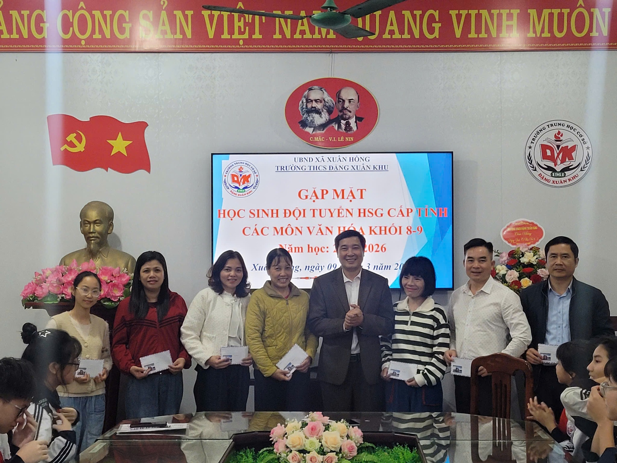 Chiều ngày 9 tháng 3 năm 2026, tại Trường THCS Đặng Xuân Khu, Ban giám hiệu nhà trường đã long trọng tổ chức Hội nghị gặp mặt giáo viên lãnh đội, các em học sinh tham dự kì thi học sinh giỏi cấp tỉnh năm học 2025-2026. Về dự hội nghị có thầy giáo Đặng Văn Lục, bí thư chi bộ, Hiệu trưởng nhà trường cùng các thầy trong Ban giám hiệu, các thầy cô được phân công lãnh đội các đội tuyển, đặc biệt, hội nghị có sự hiện diện của 19 học sinh xuất sắc thuộc về 8 đội tuyển học sinh giỏi lớp 8, 9 của nhà trường được chọn cử tham gia dự thi.